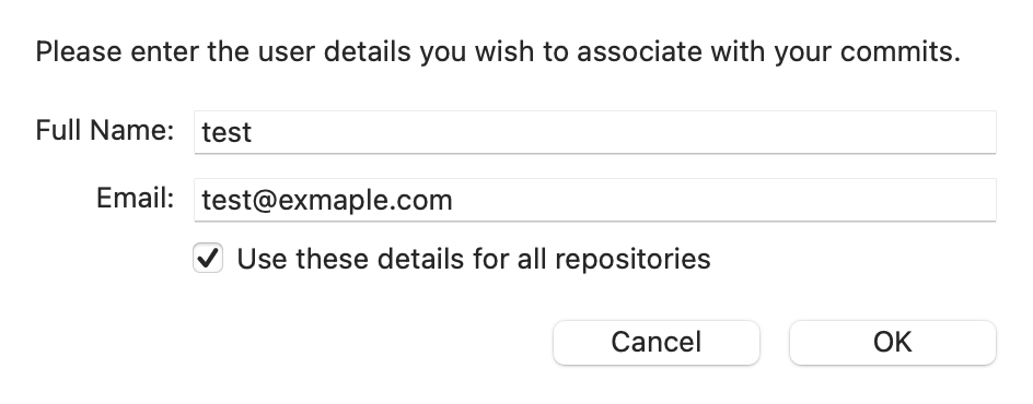 - Mac OS 환경에서 Commit버튼을 누르면 다음과 같은 팝업이 뜨게 됩니다. (사용자 정보를 등록하지 않았을 때)