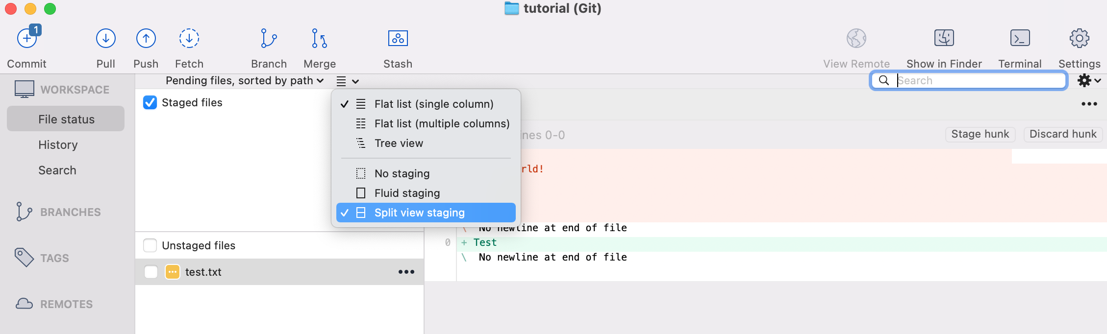 - 변경사항을 Commit하기 앞서 체크상태를 구분하여 볼 수 있게 설정이 되어 있지 않다면 아래와 같이 Split view staging을 클릭하여 구분해 볼 수 있습니다.