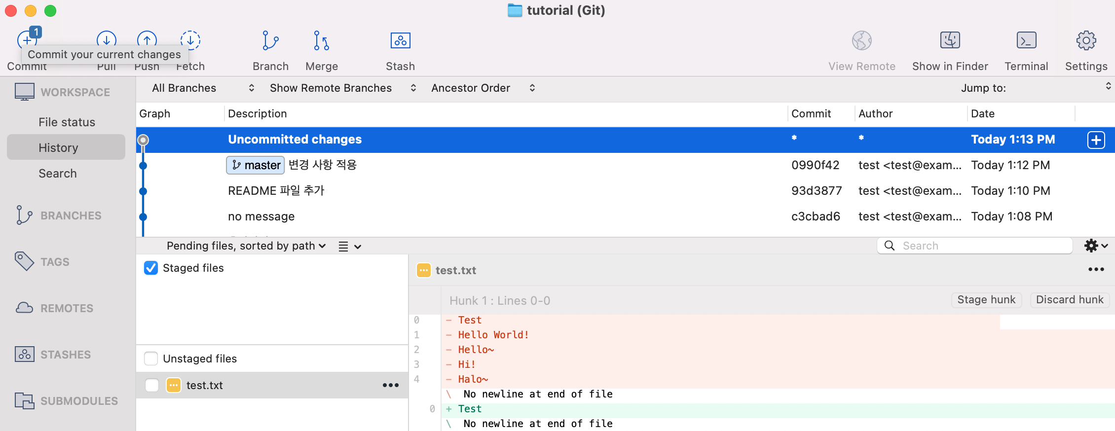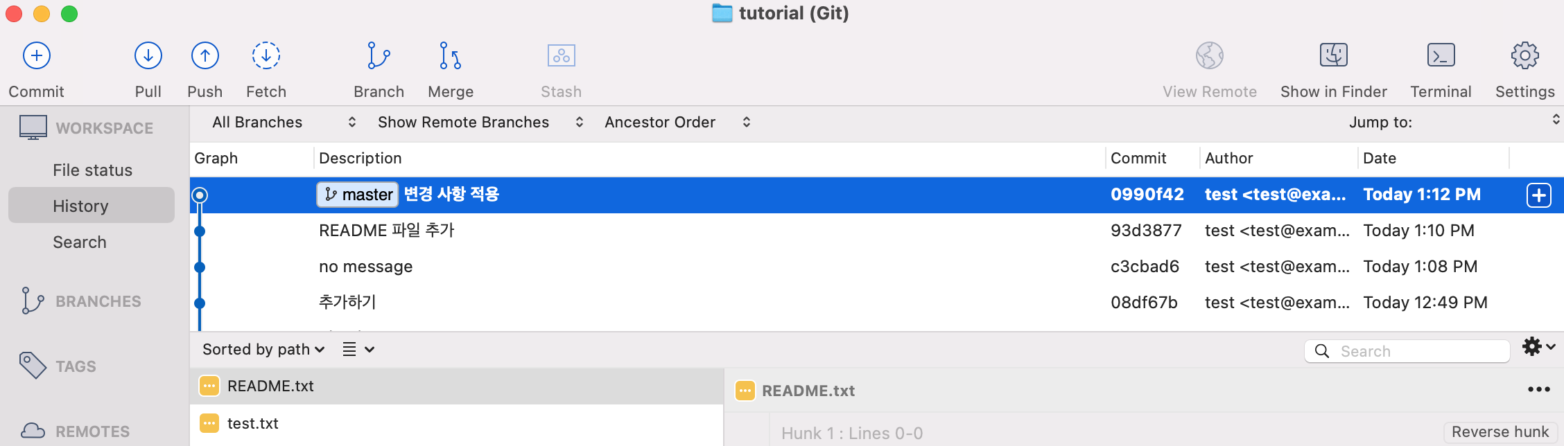 1. Local Repository에 또 다른 텍스트 파일 추가, 기존의 test 파일 수정하기