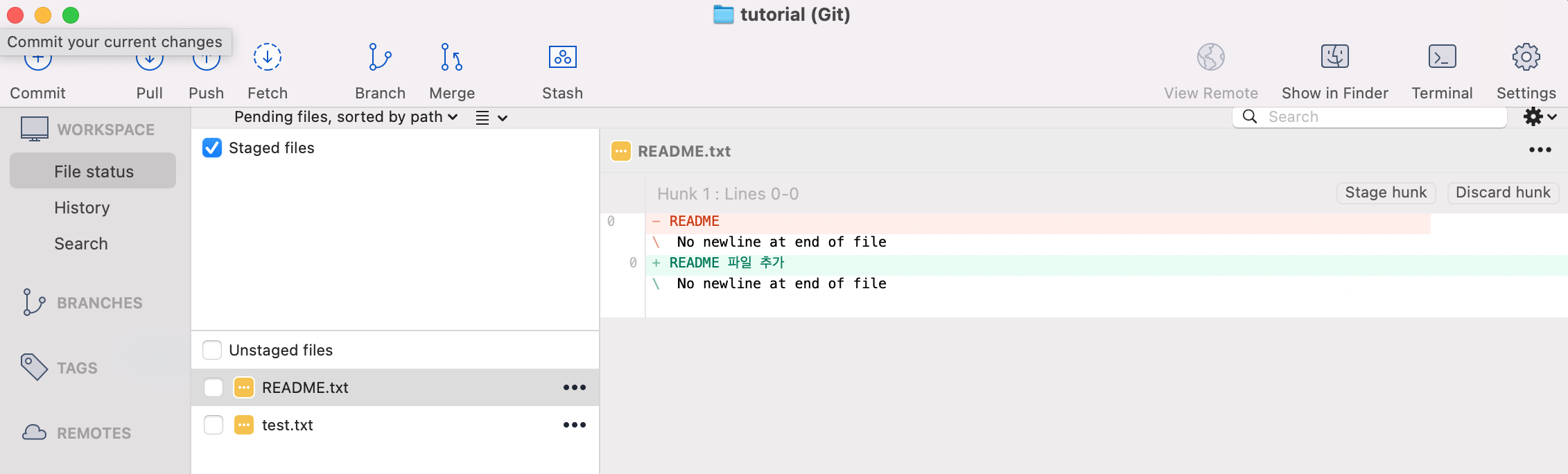 - 위의 작업을 마친 후 Sourcetree의 File Status는 다음과 같습니다.