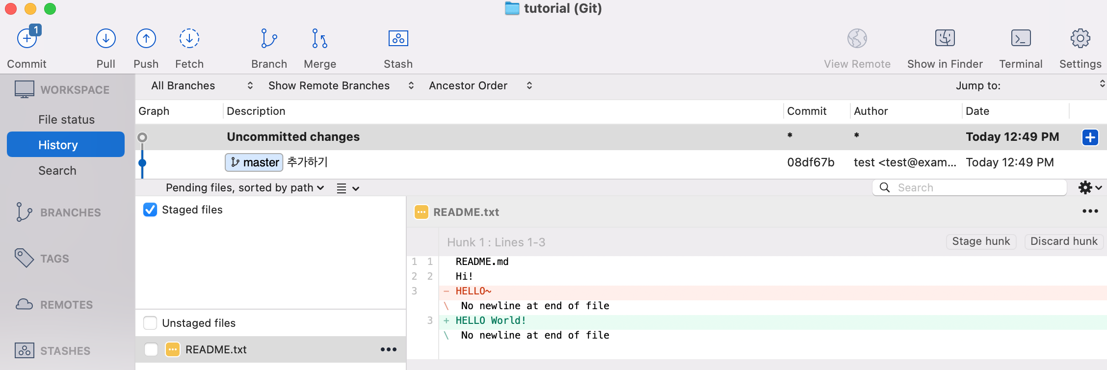 - README.md파일을 수정한 후 History를 확인해 보도록 합니다.