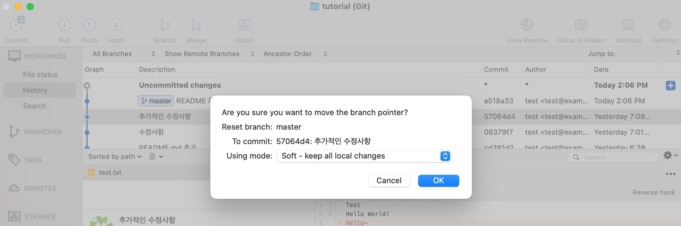 3. 현재 선택된 버전 이후의 버전만 삭제하고 Index와 Working Copy는 유지하기 (Soft - keep all local changes)