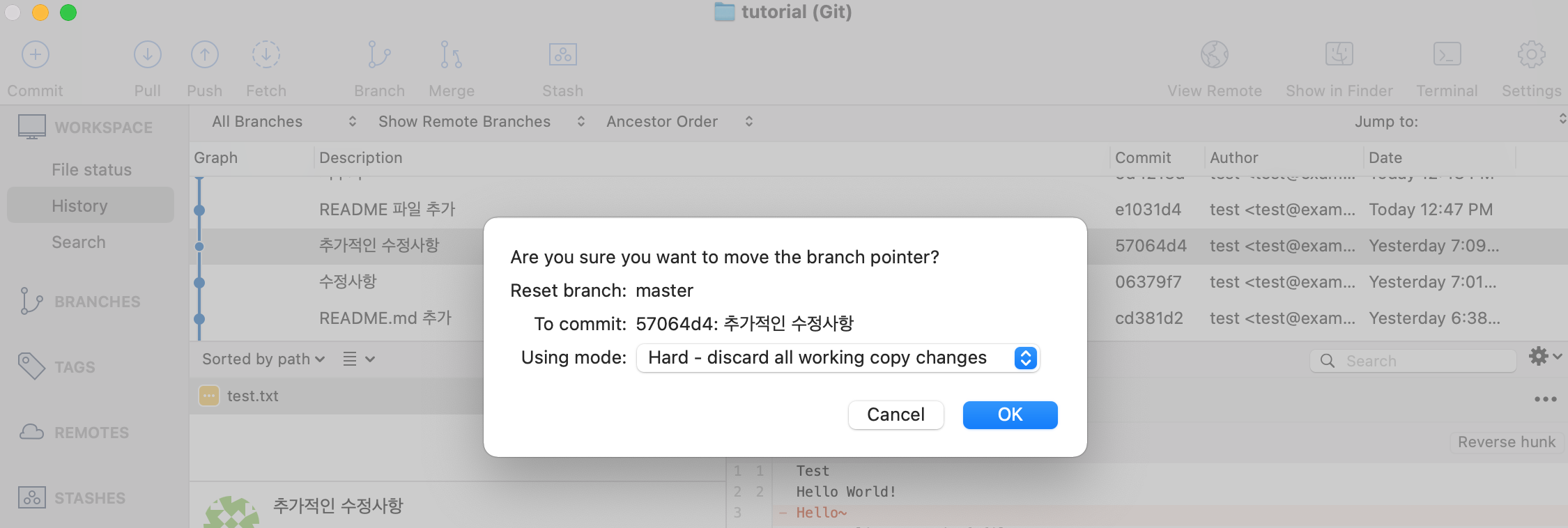 1. 현재 선택된 버전 이후의 버전, Index, Working Copy 모두 삭제하기 (Hard - discard all working copy changes)