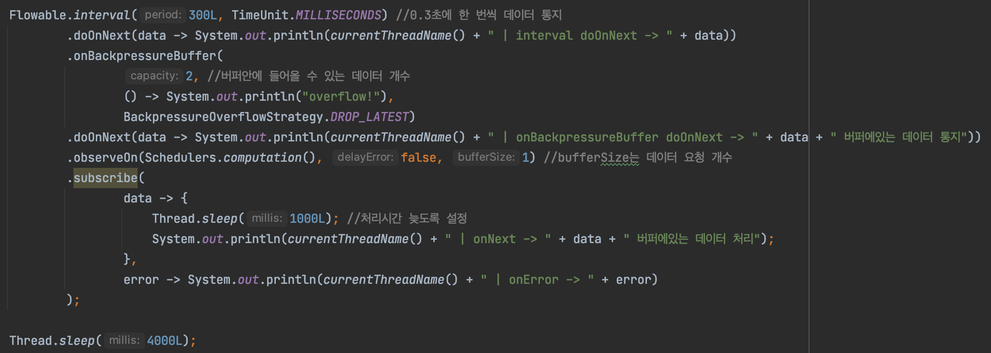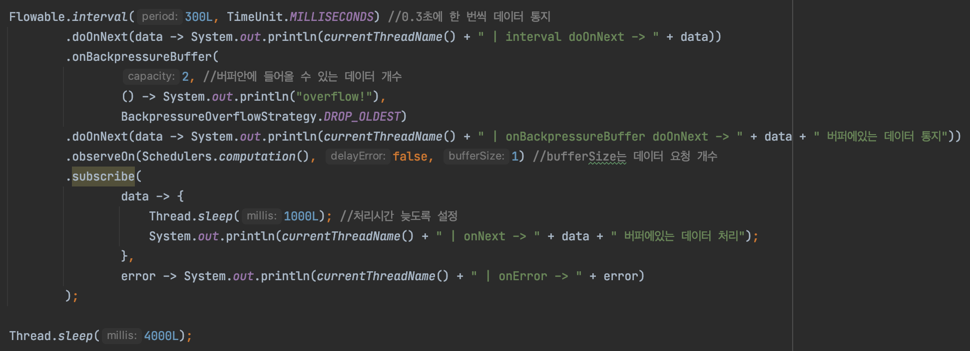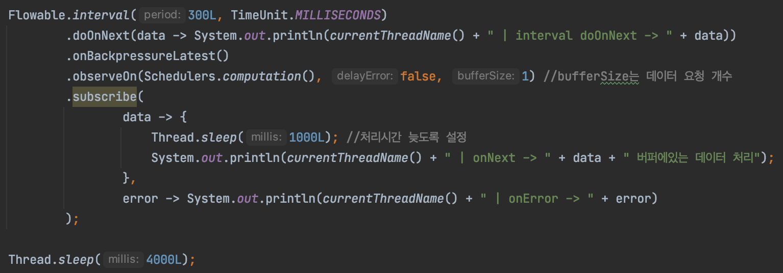 2) ERROR : 통지된 데이터가 버퍼의 크기를 초과하면 Exception을 통지하는 전략입니다. 이전 포스팅에서 배압 기능을 설명할 때 소스코드로 작성한 부분에서 ERROR전략을 확인해 볼 수 있었습니다.
