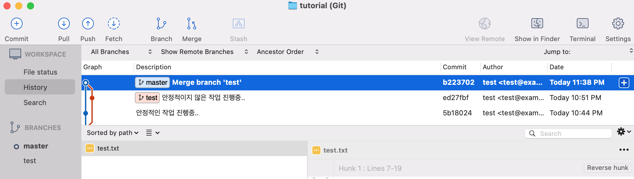 - 아래와 같이 master 브랜치로 Merge branch 'test'라는 메시지로 Commit된 것을 확인할 수 있습니다.