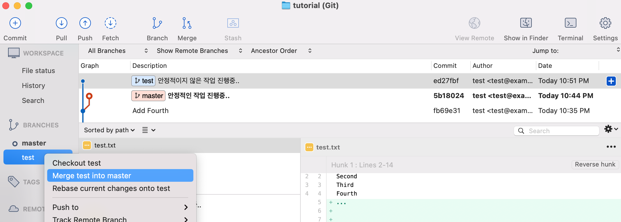 - 가지고 오려는 브랜치는 test 브랜치이기 때문에 test 브랜치에서 우클릭하여 Merge test into master를 클릭합니다.