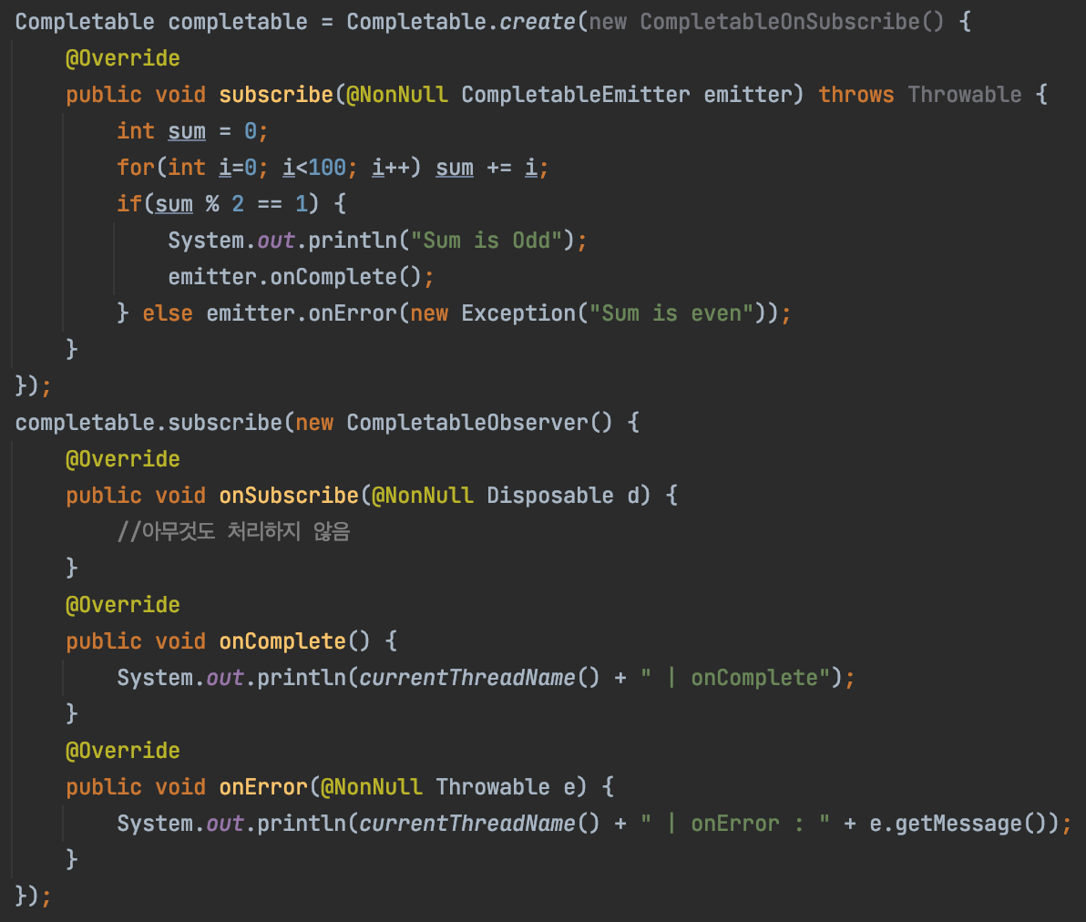 - 데이터를 1건도 통지하지 않는데 왜 이런 클래스가 필요할까요? 데이터 통지의 역할 대신에 Completable 내에서 특정 작업을 수행한 후에, 해당 작업을 끝났음을 통지하는 목적으로 사용됩니다.