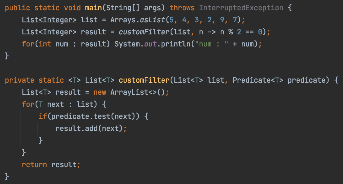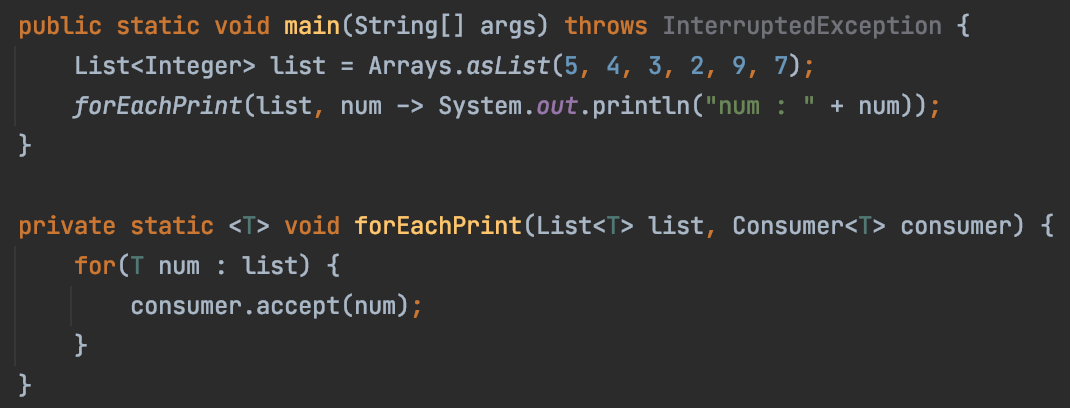 - Java 8에서 새롭게 추가된 함수형 인터페이스(Predicate, Consumer, Function) 외에 기존에 작성되어 있는 하나의 추상 메서드만 가지고 있는 Java 인터페이스(Comparable, Runnable) 또한 함수형 인터페이스로 취급할 수 있습니다.
