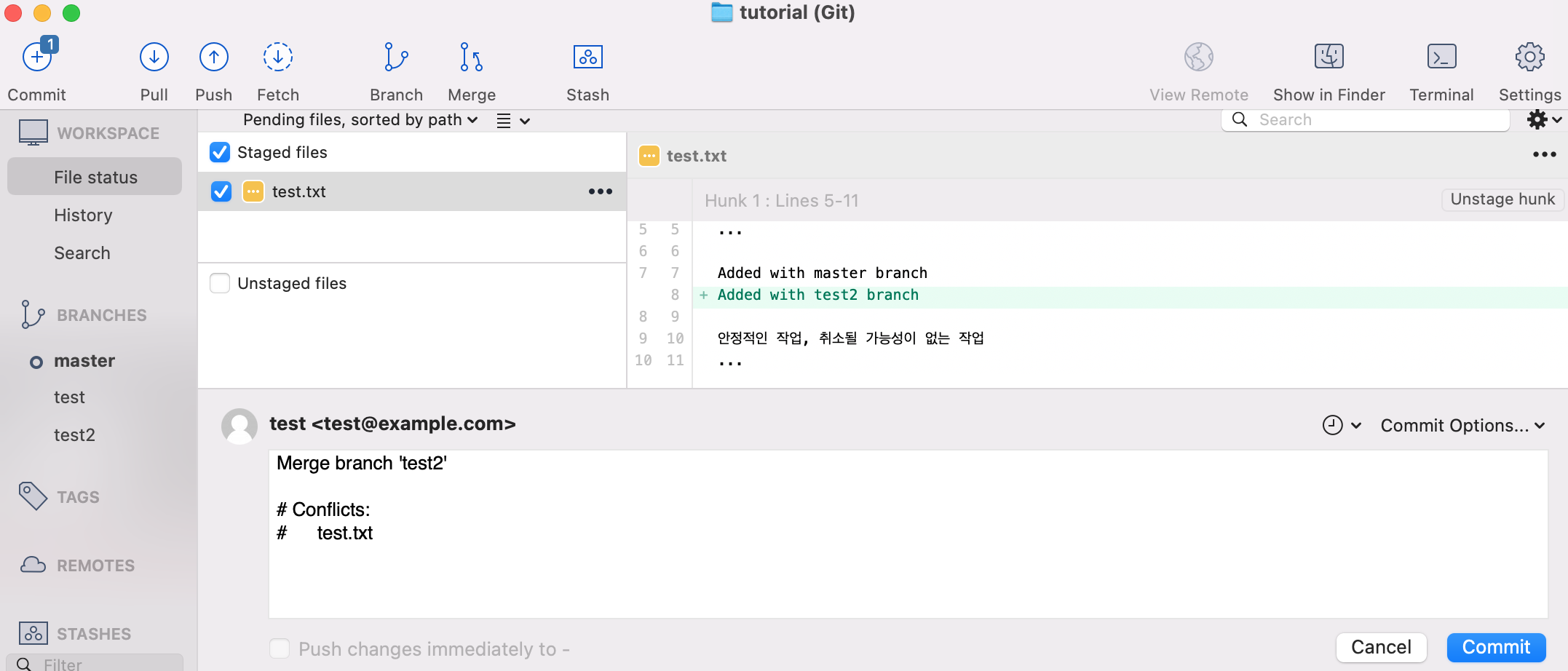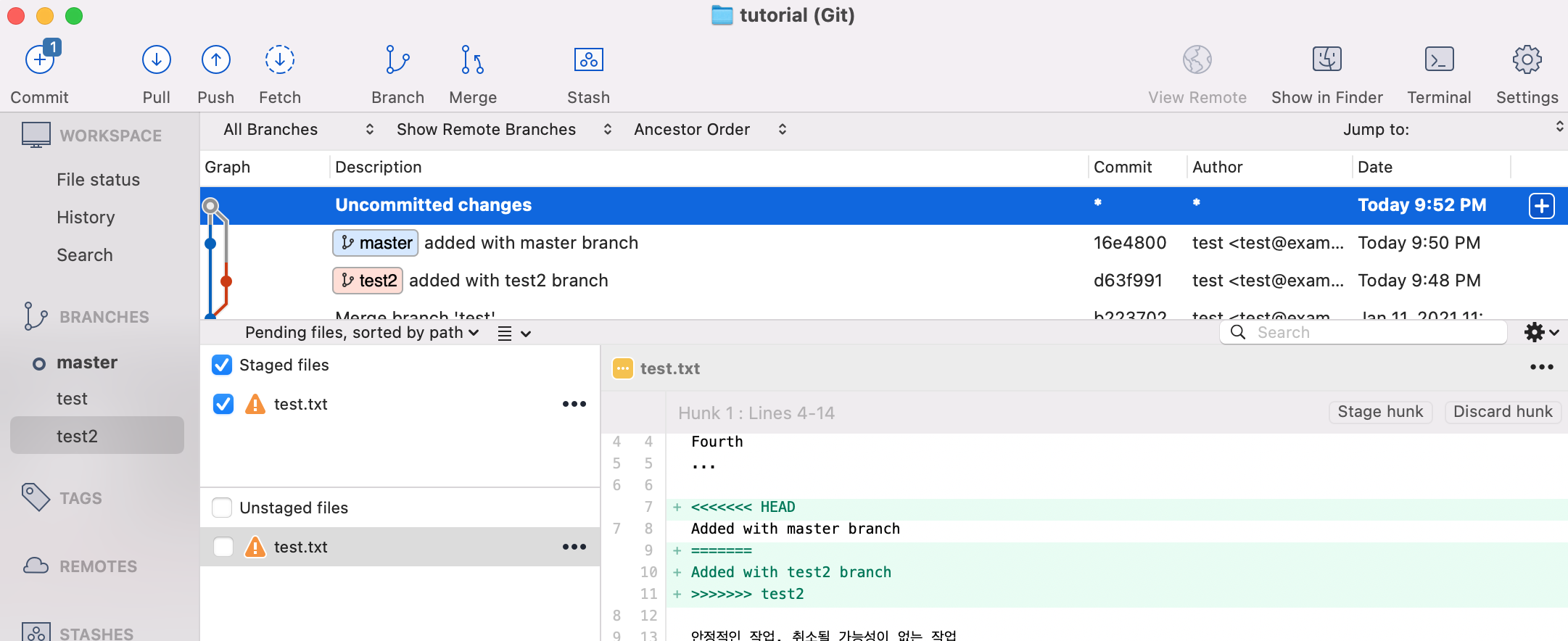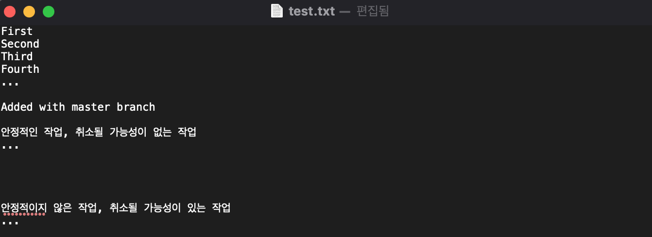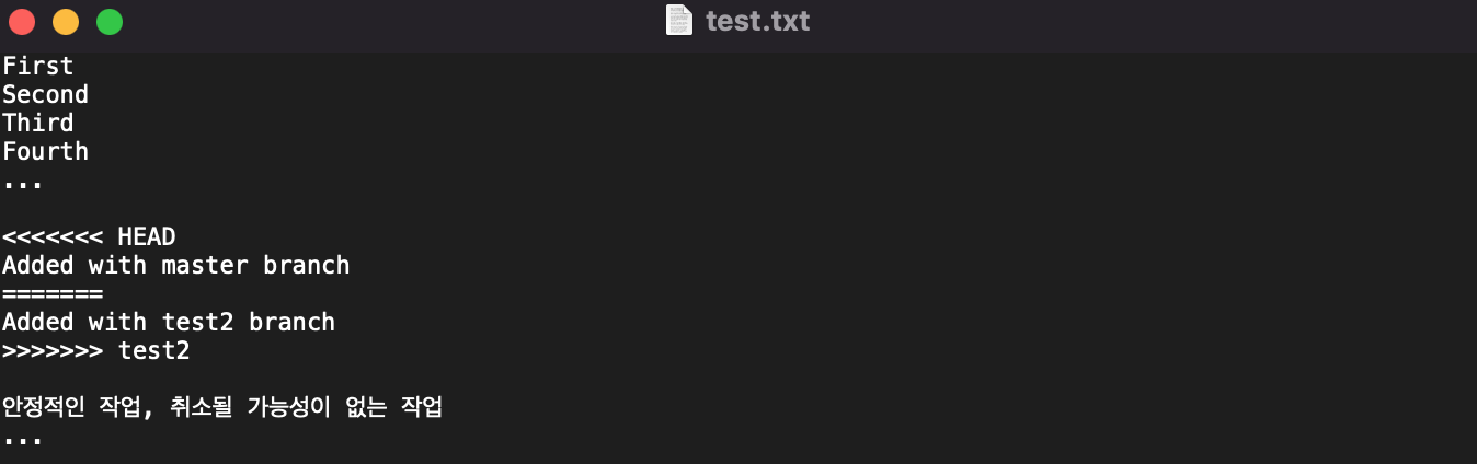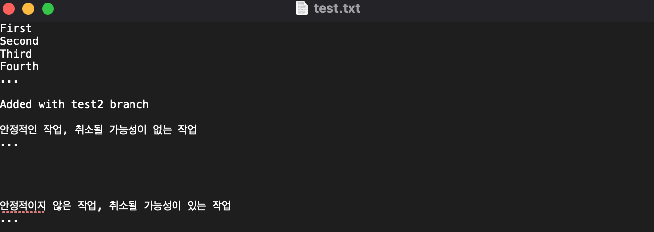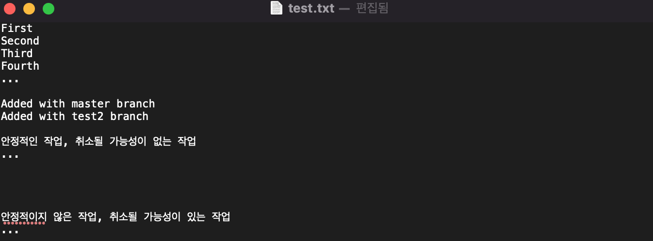 - test2 브랜치 내에서와 동일한 위치에서 텍스트 파일 내용을 수정합니다.