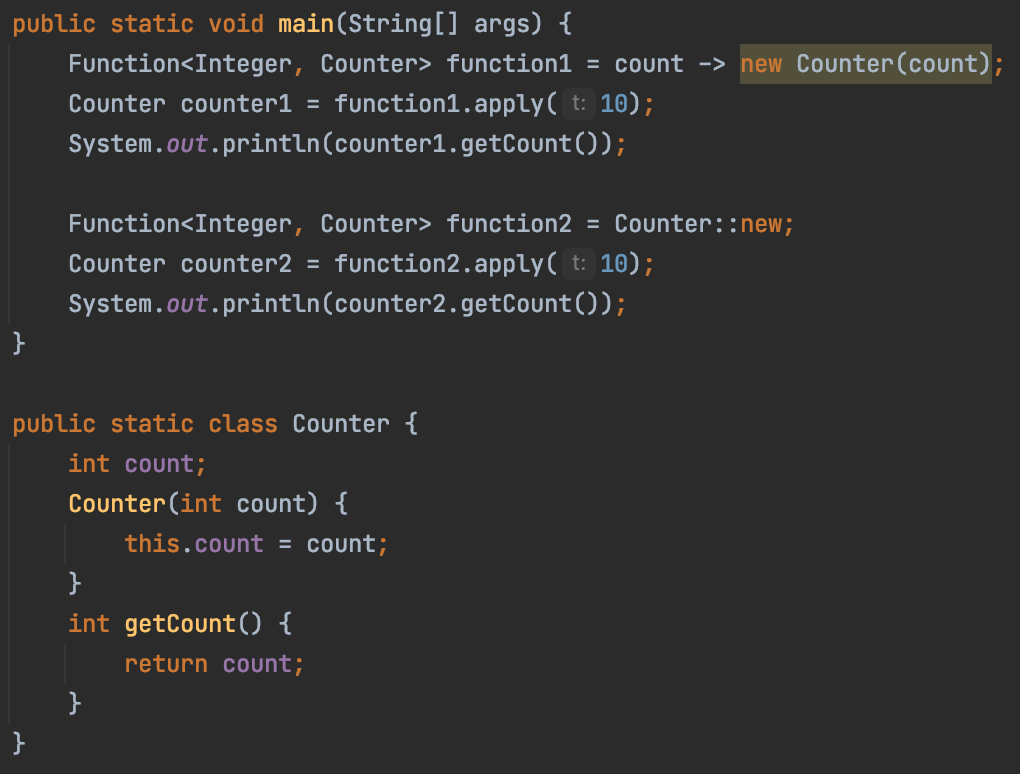 - 예) (int count) -> obj.getTotal(count) --> obj::getTotal