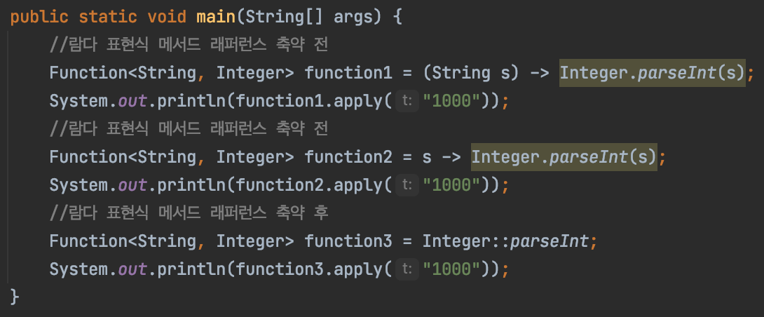- 예) (String s) -> Integer.parseInt(s) --> Integer::parseInt