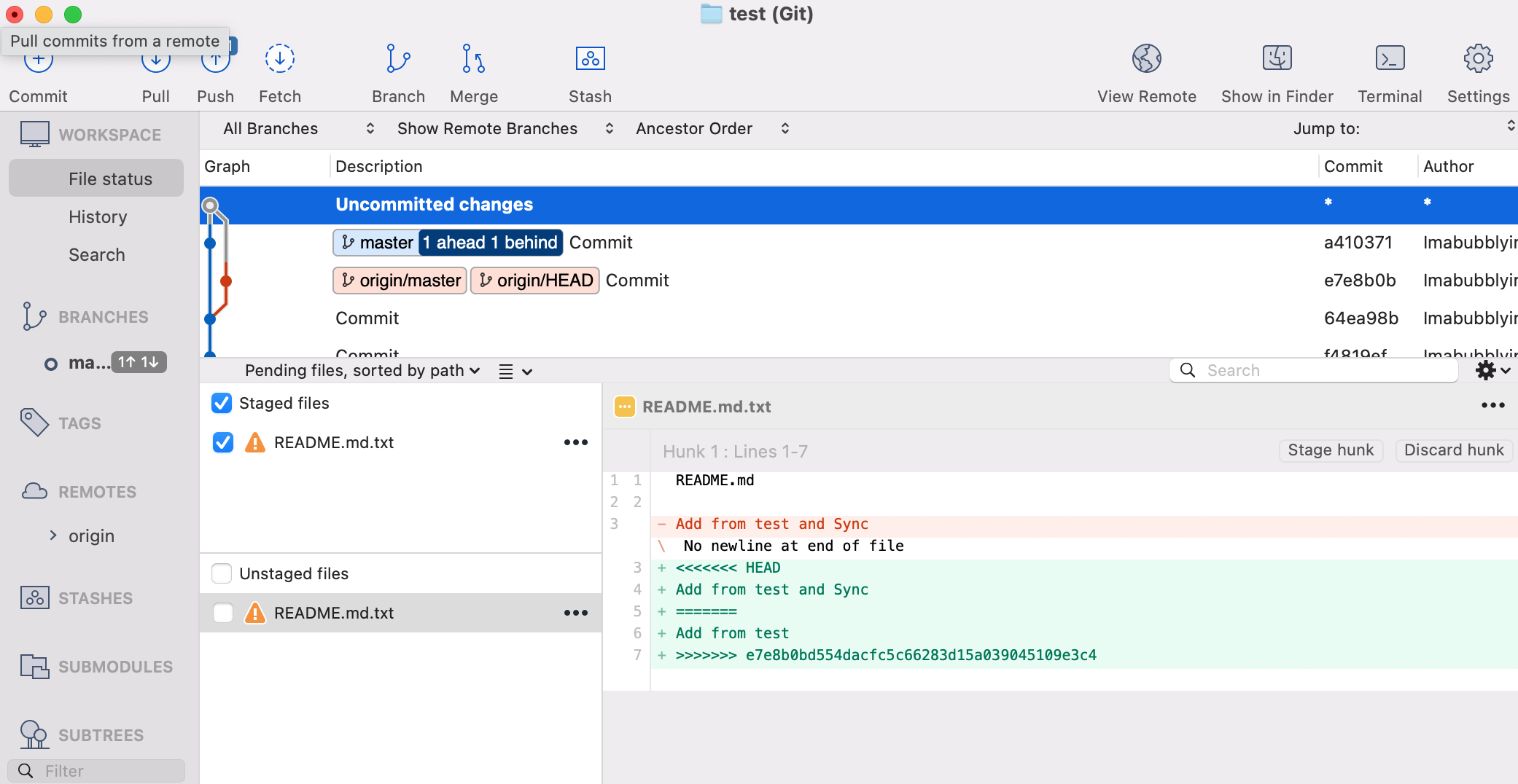 3. test2 로컬 저장소에서 작업을 진행하기 전에 Pull을 통해서 원격 저장소의 master 브랜치로부터 버전을 업데이트 합니다.