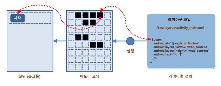 위에서 말했던 객체화 되는 과정은 위와 같은 흐름으로 표현해 볼 수 있다. XML 파일이 메모리에 로딩되어야 우리는 비로소 화면으로 보여지는 것을 확인할 수 있고, 해당 XML 파일에 정의된 뷰들을 참조할 수 있다. 실제로는 안드로이드에서 XML 파일만이 아닌 Java, Kotlin 소스 파일이 결합되어 하나의 Activity를 구성하게 된다. 여기서 Java, Kotlin 소스파일 부분은 XML 파일에서 정의한 뷰들이 실제 동작하는 부분이라고 생각하면 쉽다.