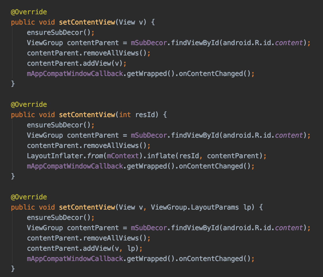 우리는 이제서야 이해가 될 것이다. 항상 봐오던 setContentView 메서드를 통해서 인플레이션 과정이 일어나고 있다는 것을 말이다. 실제로 인플레이션 과정이 일어나는지는 직접확인해 보도록 하자. 아래는 AppCompatDelegateImpl.java에 나타난 setContentView 메서드들이다.