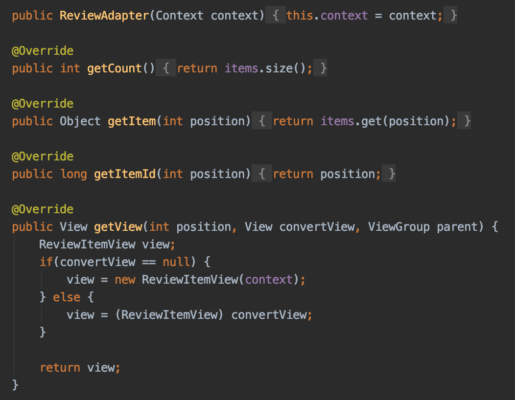 | Android - ListView에서의 getView() 메서드, ConvertView와 ViewHolder Pattern를 통해 성능 개선하기 (0) | 2021.06.21 |