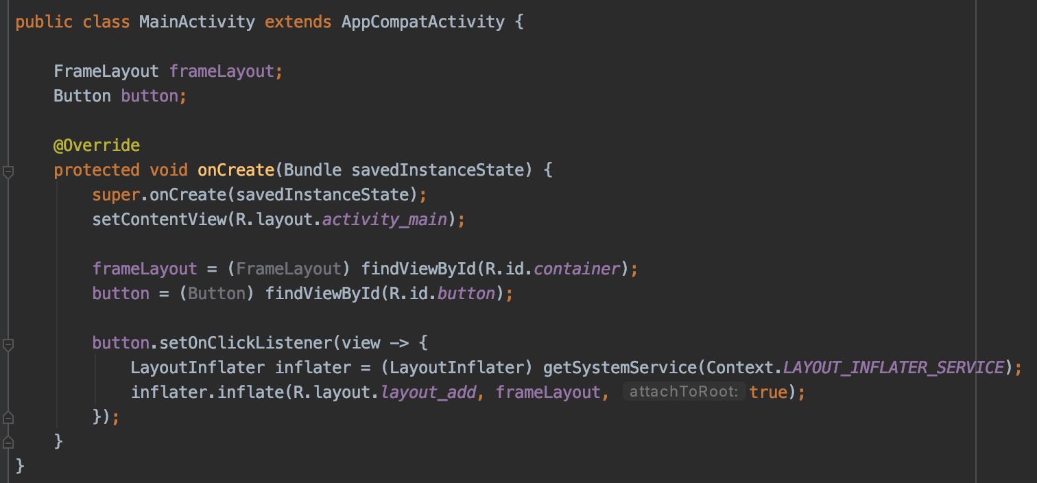 사용자로써 우리가 사용하는 대부분 앱들은 시작하면서 초기화된 전체 화면뿐만 아니라 다양한 화면들이 보여지고 사라진다는 것을 알고있다. 전체 화면이 보여진 이후에도 부분 화면들로 보이는 것들을 제어할 수 있다는 것을 의미한다. 이때 우리가 사용하는 것이 LayoutInflater의 inflate메서드 이다. 이전 포스팅에서 확인해 본 것 처럼 기본 프로젝트를 생성하면 setContentView(int resId)를 통해 실제 화면으로 보여지게 하는 것과 같은 방식이라고 할 수 있다.