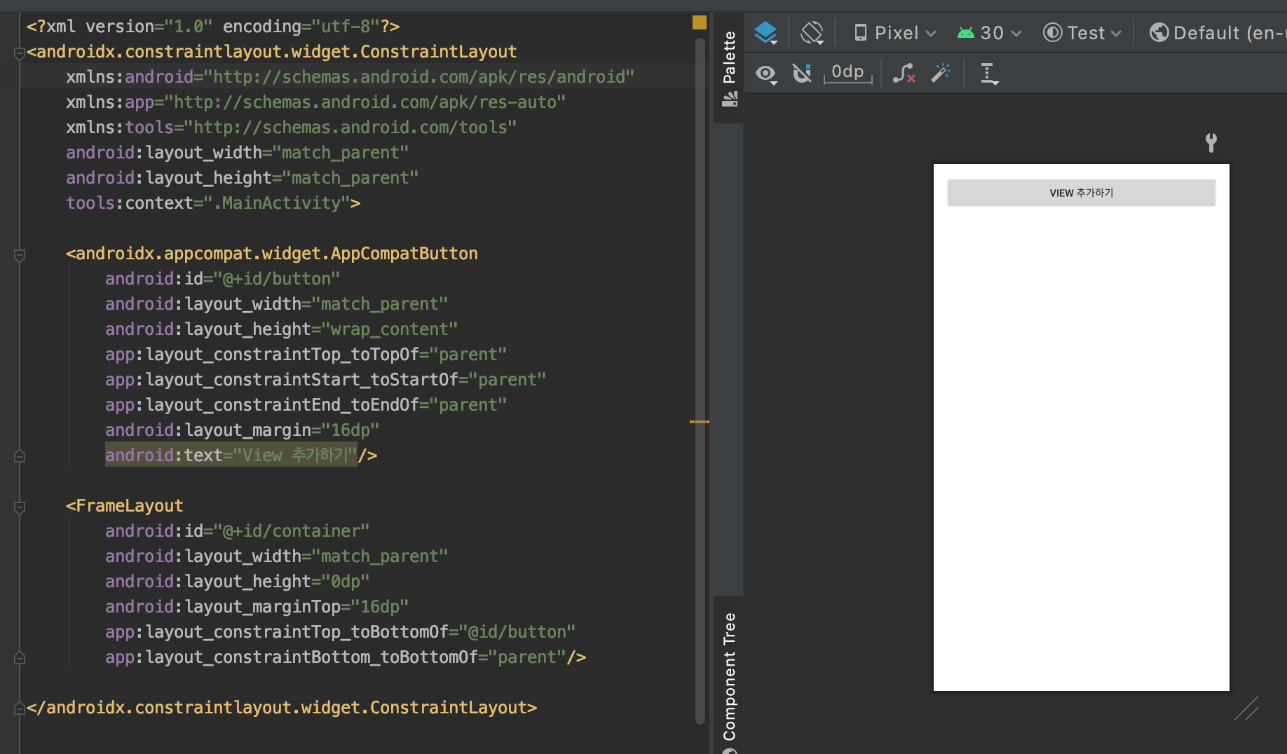 이제 앱을 실행시킨 후에 버튼을 눌러보자. 그러면 FrameLayout에 layout_add.xml 파일이 붙어 노출되는 것을 확인할 수 있다.