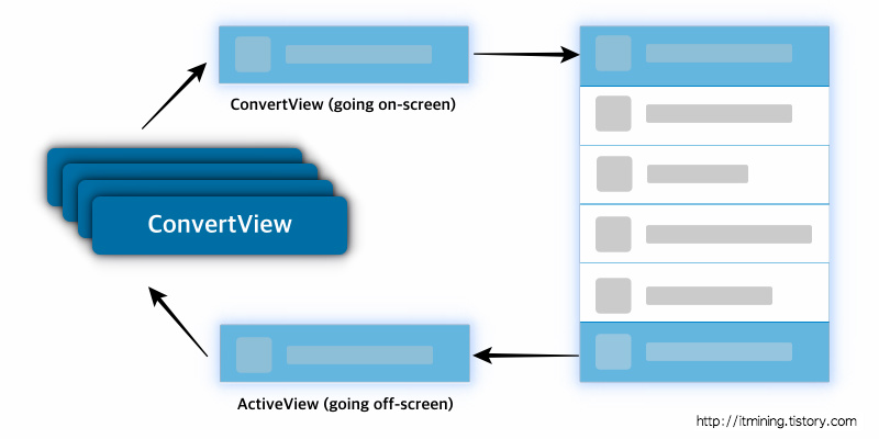 우선 converView를 알아보기전에 ListView에 먼저 알아보아야 한다. 리스트뷰는 다른 일반 View들과 다르게 성능을 위해 설계된 View이다. 위의 getView() 메서드를 다시 생각해보자. 다음에 보여질 새로운 아이템의 데이터를 보여주려면 인플레이션 과정이 계속해서 새롭게 일어나야한다. 굳이 이럴 필요가 있을까? 각 아이템은 내용만 다를뿐 레이아웃은 동일한 아이템이기 때문에 재사용할 수 있으면 얼마나 좋을 것인가? 또한 모든 아이템에 인플레이션 과정이 일어난다면 성능상으로도 좋지 않을 것 이라고 생각해볼 수 있을 것이다. 아무튼 이 문제를 해결하기 위해 설계한 View가 ListView이다. 이 문제를 해결하기 위해 ListView 는 아이템의 전체 개수가 아닌 화면에 보여지는 개수 만큼만 View를 그려놓은 뒤 그것을 재활용하는 구조로 설계 되었다. 예를 들어 아이템의 개수가 50개라 가정하고 실제로 화면에 보여지는 아이템이 5개라고 한다면 모든 아이템들의 View를 생성하여 보여주는 것이 아니라 화면에 보이는 5개의 아이템만 보여준다. 여기서 ListView 스크롤이 내려가게되면 첫 번째 View는 사라지고 6번째의 View가 보여진다. 이 때 6번째의 View는 새로 생성되는 것이 아니라 기존에 만들어진 View를 재사용하게 되는데 그것이 바로 convertView인 것이다. 아래 그림을 확인해보도록 하자.