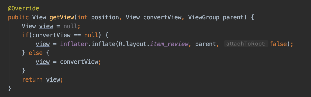 iron9462 2021. 6. 21. 21:10Android 공부를 시작하다보면 여러개의 아이템을 보여줄 수 있는 ListView를 접하게 된다. 좀 더 진도를 나아가보면 훨씬 더 중요하고 자주 쓰이는 RecyclerView를 접하게 되지만, 이번 포스팅에서는 ListView에 초점을 두어 작성해보려고 한다. 이전 포스팅에서 BaseAdapter를 상속한 Adapter의 getView() 메서드에서 인플레이션 과정이 일어나는 것을 설명했다. 다시 한 번 알아보도록 하고, 이것을 개선시킬 수 있는 방법인 ConvertView와 ViewHolder pattern에 대해서도 알아보도록 하자.