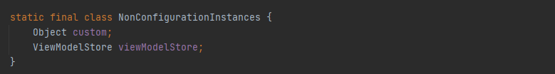 NonConfigurationInstances클래스는 위와 같습니다. 멤버인 ViewModelStore가 메모리에 올라가 있는지 체크해주고, 메모리에 올라가있지 않다면 new 키워드를 통해서 객체를 생성하고 있다는 것인데 이것은 즉, ViewModel을 저장할 수 있는 저장소를 만든다는 의미인 것 같습니다!