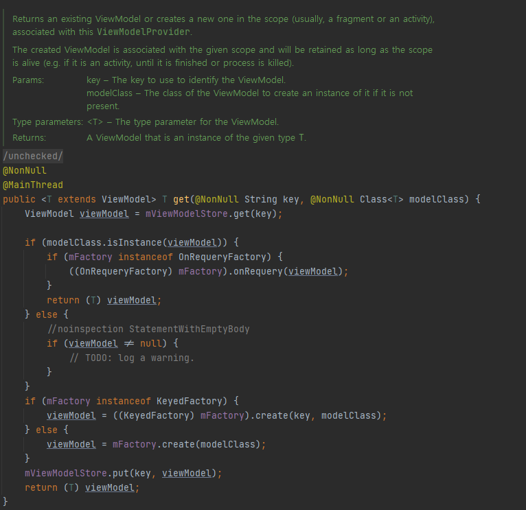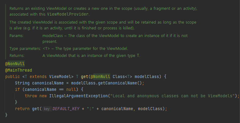 멤버함수 get을 살펴보면 파라미터로 넘겨준 modelcClass의 getCanonicalName 멤버함수를 호출하여 null 체크를 해준다. 여기서 getCanonicalName()은 사용자에게 잘 알려져있는 표준적인 이름을 반환하는 Class의 멤버 함수입니다. 파라미터 내용을보면 modelClass는 실제로 ViewModel을 생성할 수 있는 클래스의 이름을 나타내는 파라미터라고 명시되어 있습니다. 그러면 다시 return에서 사용되는 get 멤버 함수를 따라가 봅시다.