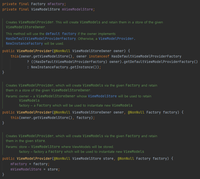 이쯤에서 생성자를 살펴보면 될 것 같습니다. 위의 코드에서 사용한 ViewModelProvider 생성자를 확인해보니 아래와 같이 2가지의 경우가 있습니다.