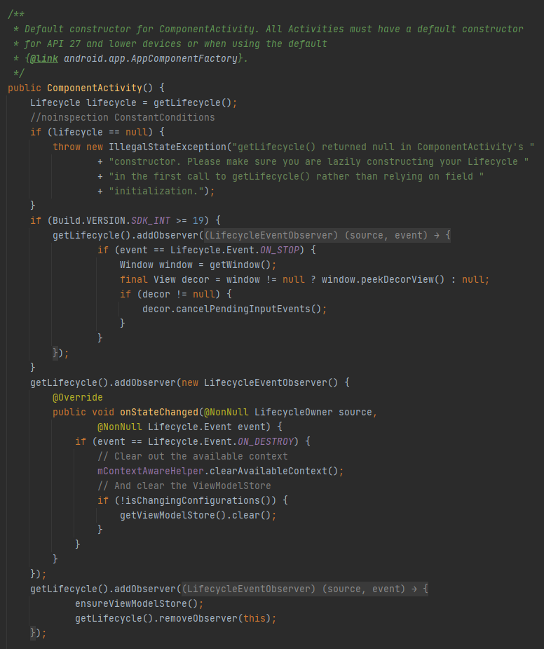 ComponentActivity의 생성자 로직을 살펴보면, getLifeCycle()에 Observer를 등록해준 것을 확인할 수 있습니다. LifecycleEventObserver가 LifeCycler.Event를 감지하고 있다가 ON_DESTROY인 상태가 됐을 때, ViewModelStord의 멤버 함수인 clear()를 통해서 메모리를 해제하게 됩니다.