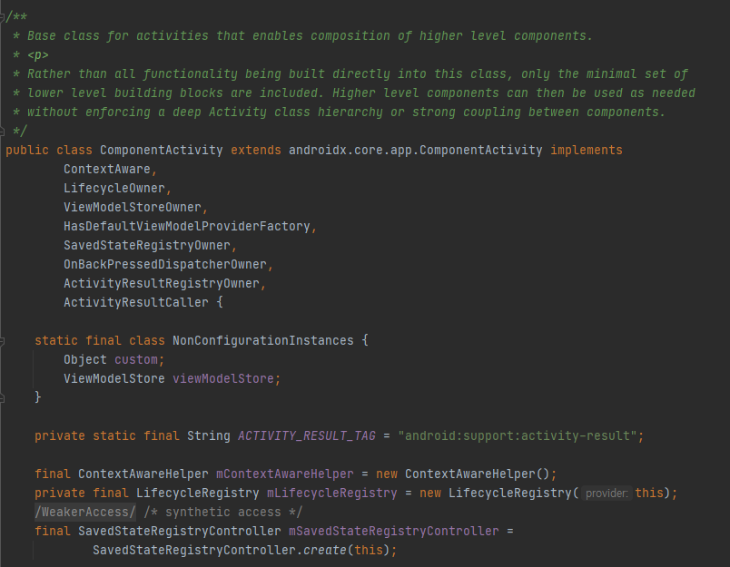 아래에서 ViewModelProvider 생성자를 확인하면 알 수 있겠지만, 우리는 ViewModelProvider의 생성자 첫 번째 파라미터로 ViewModelStoreOwner를 넣어주고 있습니다. 어떻게 this 키워드를 사용하여 파라미터를 전달할 수 있을까요?? 바로 AppCompatActivity -> FragmentActivity -> ComponentActivity 까지 들어가보면 알 수 있습니다. ComponentActivity는 ViewModelStoreOwner 인터페이스를 구현하고 있는 것을 확인할 수 있습니다. 아래 이미지에서 어떤 메서드를 구현하고 있는지 확인해봅니다.