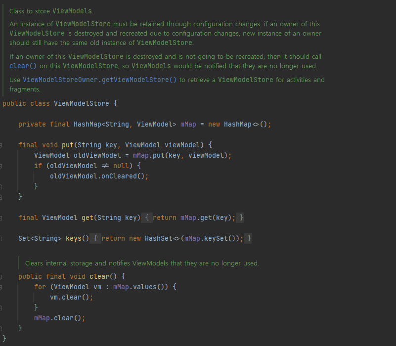 앞에서 추측해봤던 ViewModelStore가 어떤식으로 구성되어 있는지 확인해 보겠습니다. 역시나 멤버로 HashMap을 사용하고 있습니다. 기존에 알고 있던 HashMap을 다루는 것과 사용법은 비슷해서 어려움이 없을 것으로 생각됩니다.