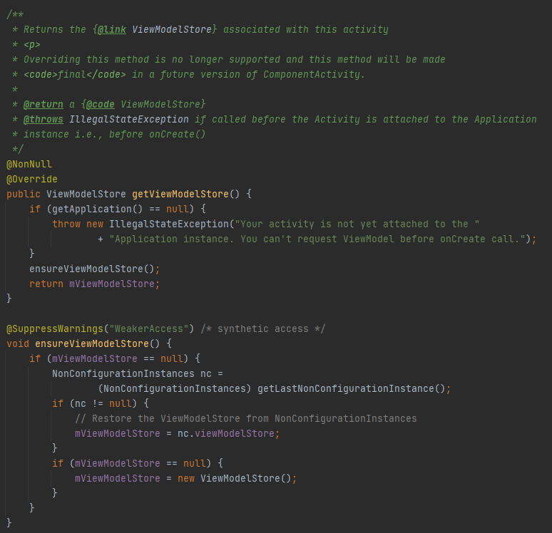 위의 이미지를 확인해보면 ViewModelStoreOwner 인터페이스를 구현한 메서드인 getViewModelStore()를 확인할 수 있습니다. 메서드의 의미를 짐작해보면 ViewModelStore를 가져오겠다는 것을 알 수 있을 것 입니다. 여기서, NonConfigurationInstances의 멤버 변수인 ViewModelStore가 있는지 없는지에 따라서 ViewModelStore를 생성하고 있는 것을 확인할 수 있습니다.